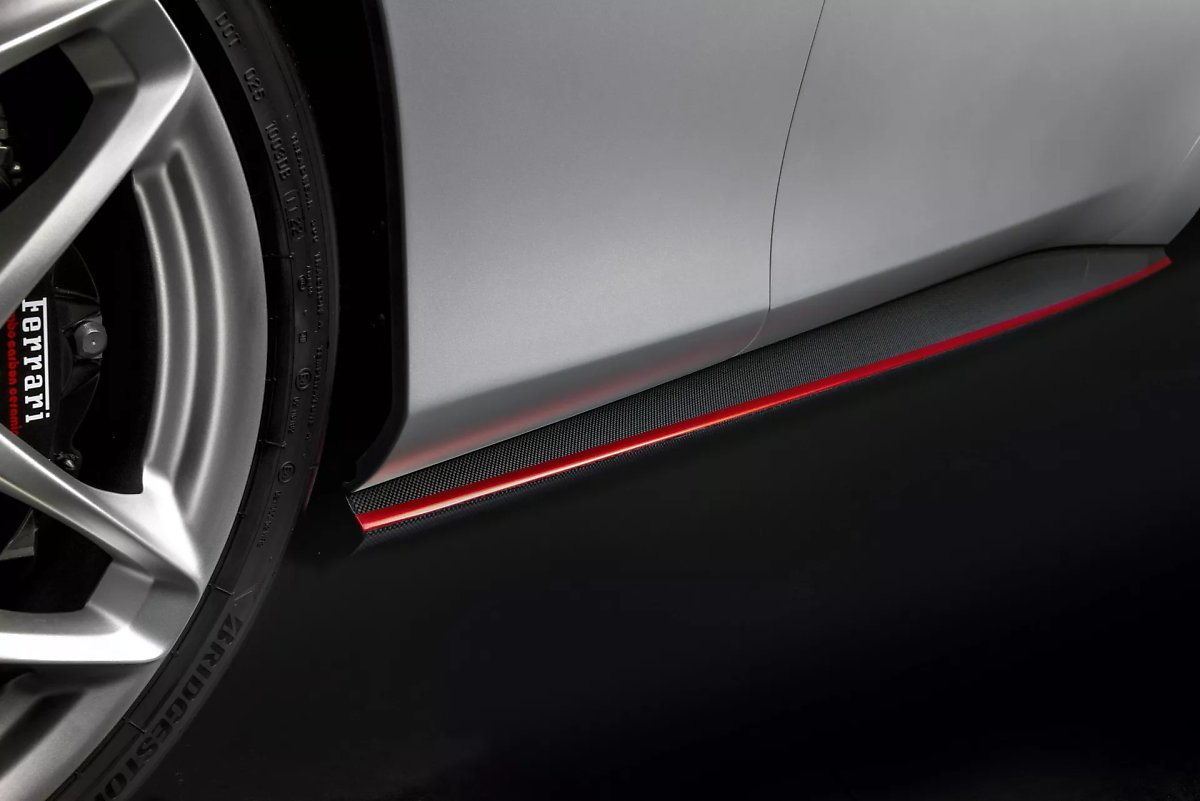페라리 로마 스페셜 에디션의 외장 디자인은 사누실버 매트 외장 컬러를 베이스로 하며, 차체 중앙과 탐소섬유 사이드실을 따라 그린 핀 스프라이프는 ‘로소 마그나 글로시’ 컬러로 마감됐다.
