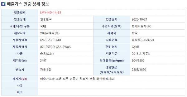 환경부 산하 국립환경과학원 교통환경연구소에 따르면, 제네시스는 지난 14일 GV70 2.2 디젤 2WD와 AWD의 환경부 인증을 완료하고, 21일 GV70 2.5 가솔린 2WD 및 AWD와 3.5 가솔린 AWD 모델의 배출가스 및 소음 인증을 완료했다.