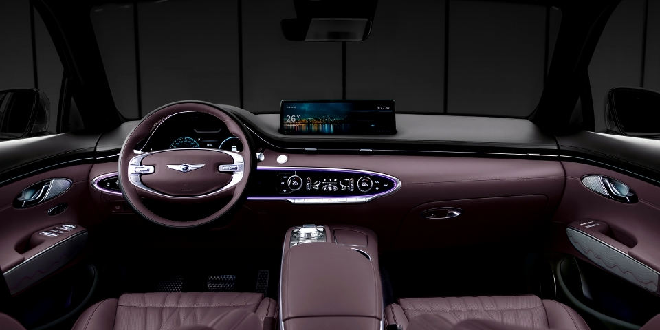 특히, 비행기 날개의 유선형(에어로다이나믹) 조형에서 영감을 받은 스포티한 실내 디자인은 유니크한 타원형 요소를 사용, 풍부한볼륨감을 살렸고 이를 강조하는 신개념 무드조명으로 GV70만의 개성을 살렸다.