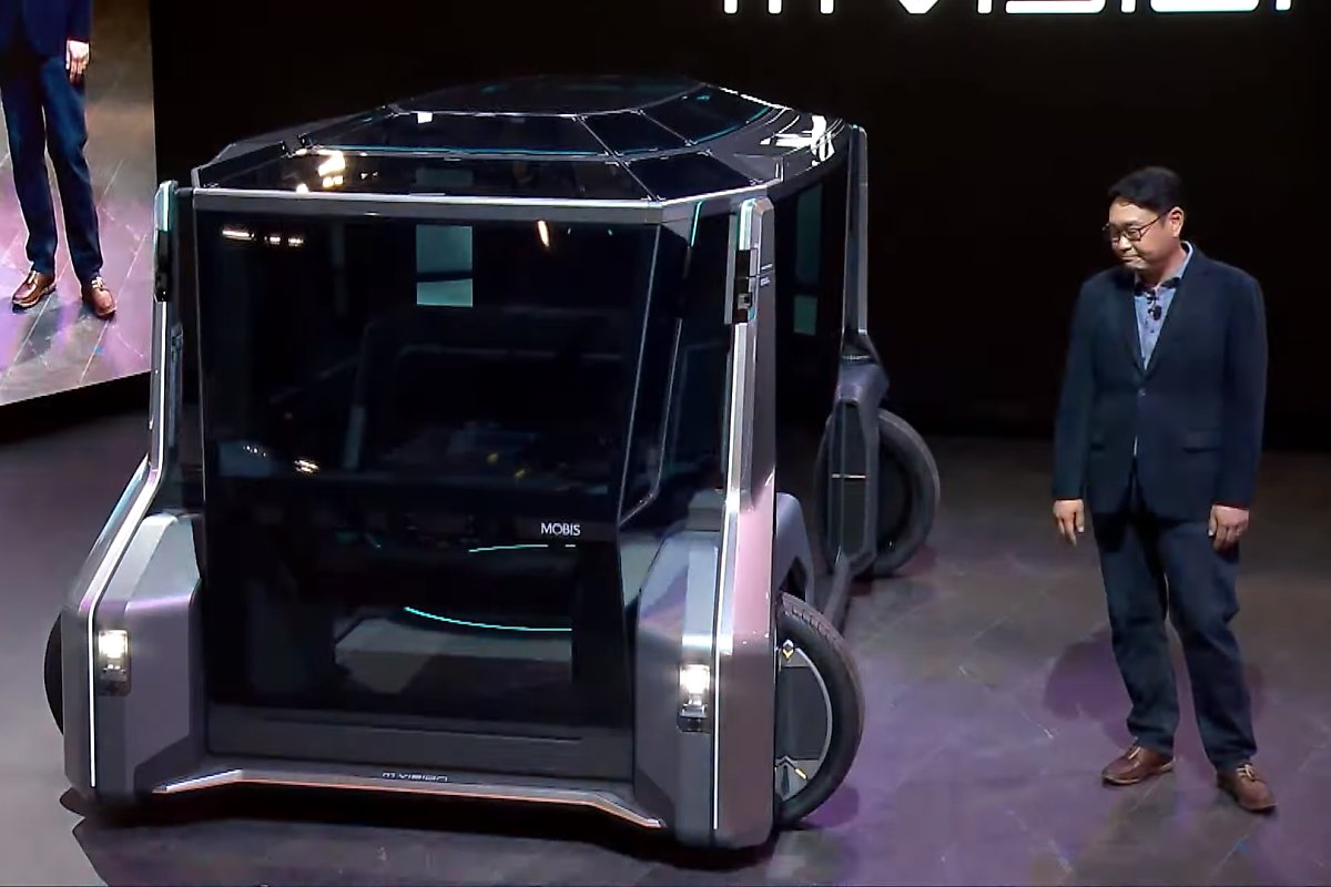 천재승 현대모비스 연구개발(R&D) 부문장이 엠비전 TO 컨셉트에 대해 설명하자 차량은 4개의 바퀴를 90도로 돌린 뒤 천 부문장을 향해 수평으로 이동하기 시작했다.