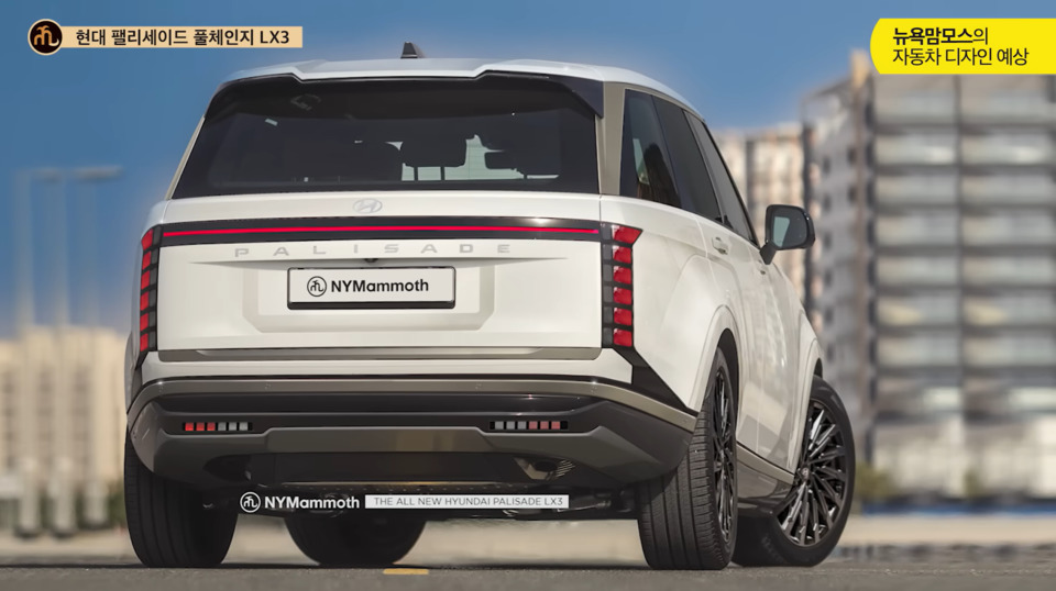 예상도 전문 유튜브 채널 뉴욕맘모스가 게재한 팰리세이드 풀체인지 예상도는 최근 포착된 테스트카 스파이샷을 기반으로 디테일하게 수정돼 최종형으로 제작됐다.