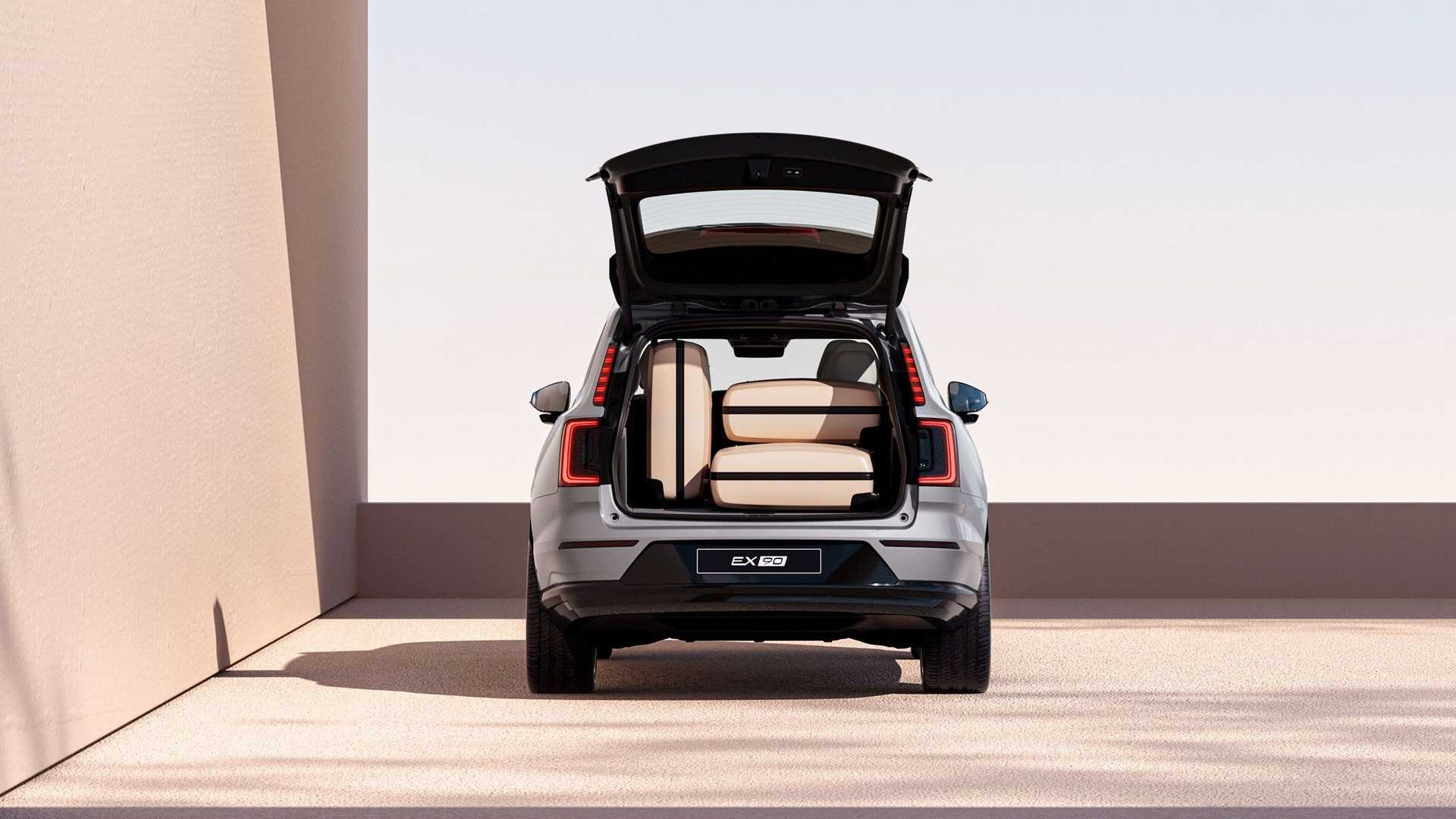 후면부는 볼보 특유의 일체형 수직 테일램프 디자인을 재해석한 스타일링이 눈길을 끈다. 테일게이트에 'ㄷ‘자 형태의 슬림한 조명과 리어 윈드실드 양 옆에 수직형 조명이 볼보 C40리차지처럼 연결선 같은 그래픽이 적용됐다. 새로운 EX90 엠블럼도 돋보인다.