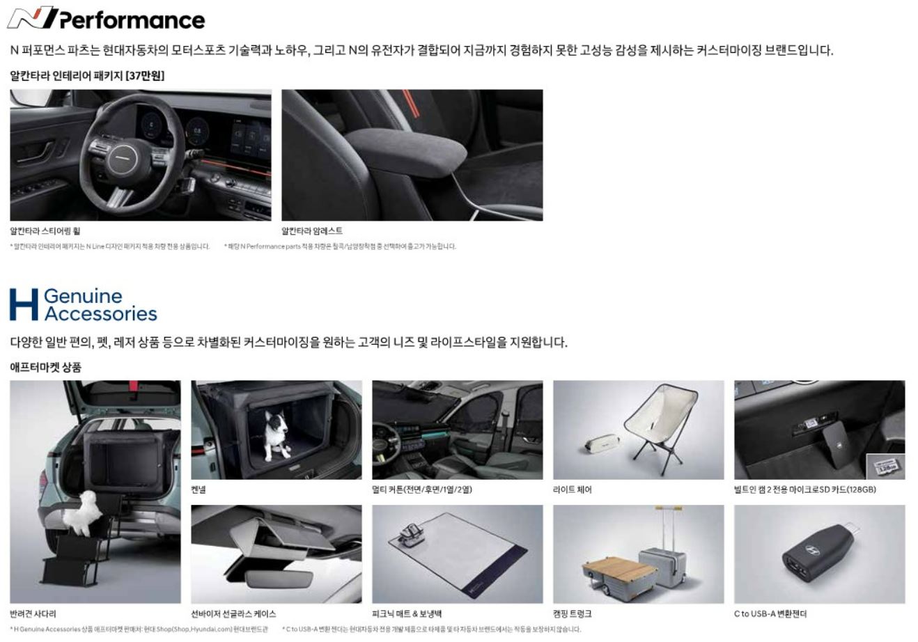 이밖에 현대차의 고성능 모터스포츠 감성을 더해주는 커스터마이징 브랜드 ‘N Performance’에서 제공하는 ‘알칸타라 인테리어 패키지(37만원)’도 선택할 수 있다. 해당 사양은 스티어링 휠과 센터 암레스트에 알칸타라 소재로 마감된다. 이를 모두 추가하면 두 가지 풀옵션 사양의 차량 가격은 각각 4,000만원과 4,050만원이다.