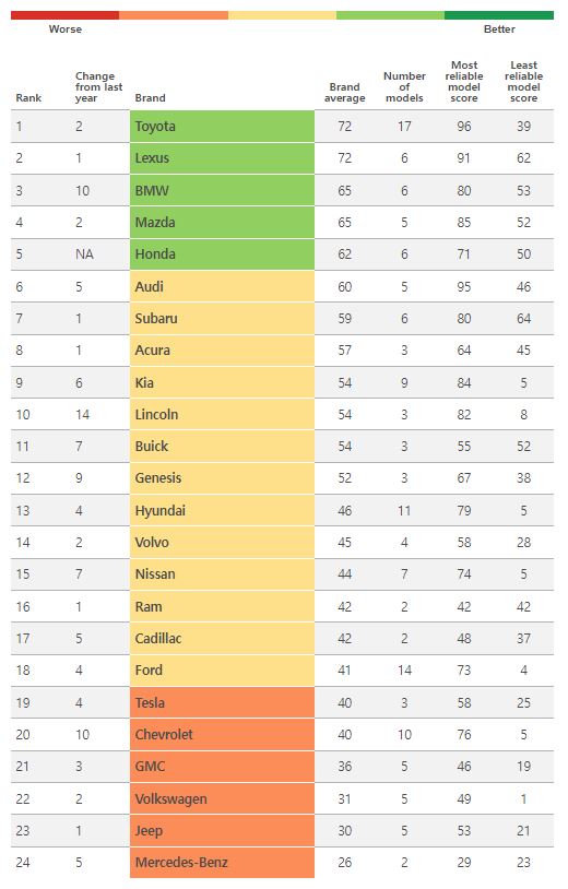 오토모티브 뉴스 등 외신에 따르면, 미국 소비자 전문매체 컨슈머리포트는 24개 글로벌 자동차 브랜드의 신뢰도 조사 결과를 발표, 상위권에 일본차들이 포진한 가운데 일부 브랜드의 순위가 눈에 띄게 달라졌다.