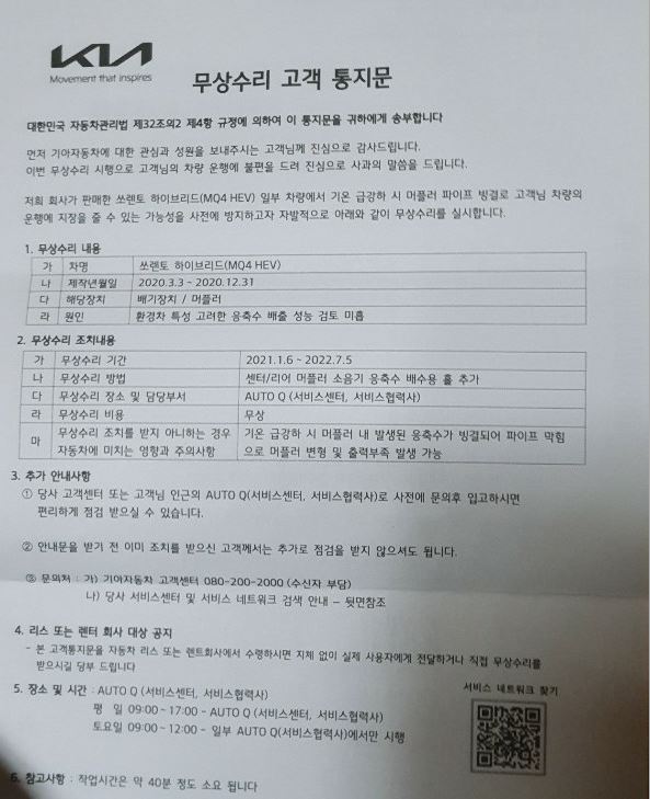 기아 측도 해당 문제를 인지, 쏘렌토 하이브리드 차주들에 무상수리 고객 통지문을 전달, 2021년 1월 6일∼2022년 7월 5일까지 ‘센터/리어 머플러 소음기 응축수 배수용 홀 추가’ 무상수리를 진행하고 있다.