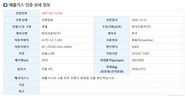환경부 산하 국립환경과학원 교통환경연구소에 따르면, 제네시스는 지난 14일 GV70 2.2 디젤 2WD와 AWD의 환경부 인증을 완료하고, 21일 GV70 2.5 가솔린 2WD 및 AWD와 3.5 가솔린 AWD 모델의 배출가스 및 소음 인증을 완료했다.