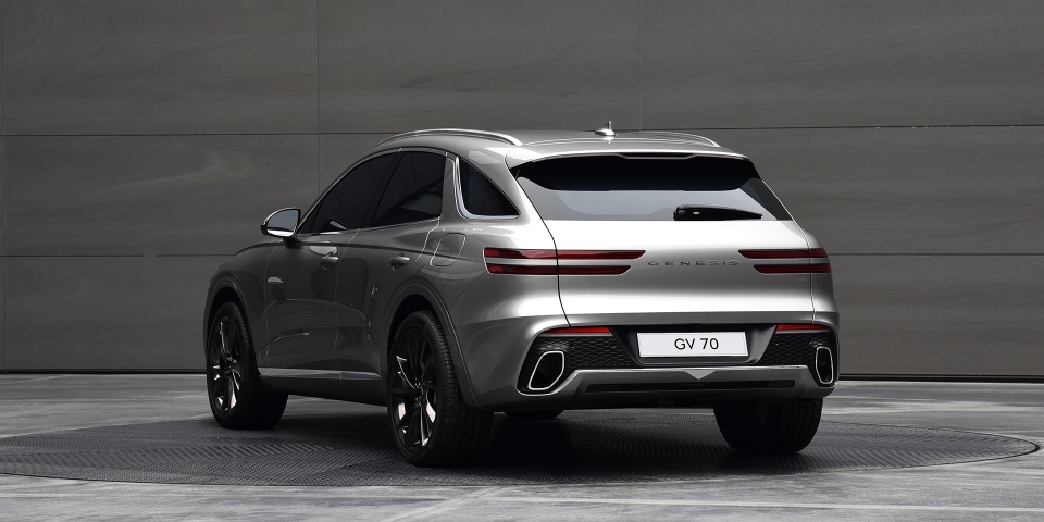 후면부는 전면과 동일한 두 줄 컨셉 쿼드 테일램프가 시선을 사로잡는데, 훨씬 와이드하고 미래지향적인 스타일이 적용됐으며, 그래픽도 차이를 보인다. 여기에 독특한 리어 스포일러의 보조제동등과 스포티한 리어범퍼 디자인도 GV70만의 차별점이다.