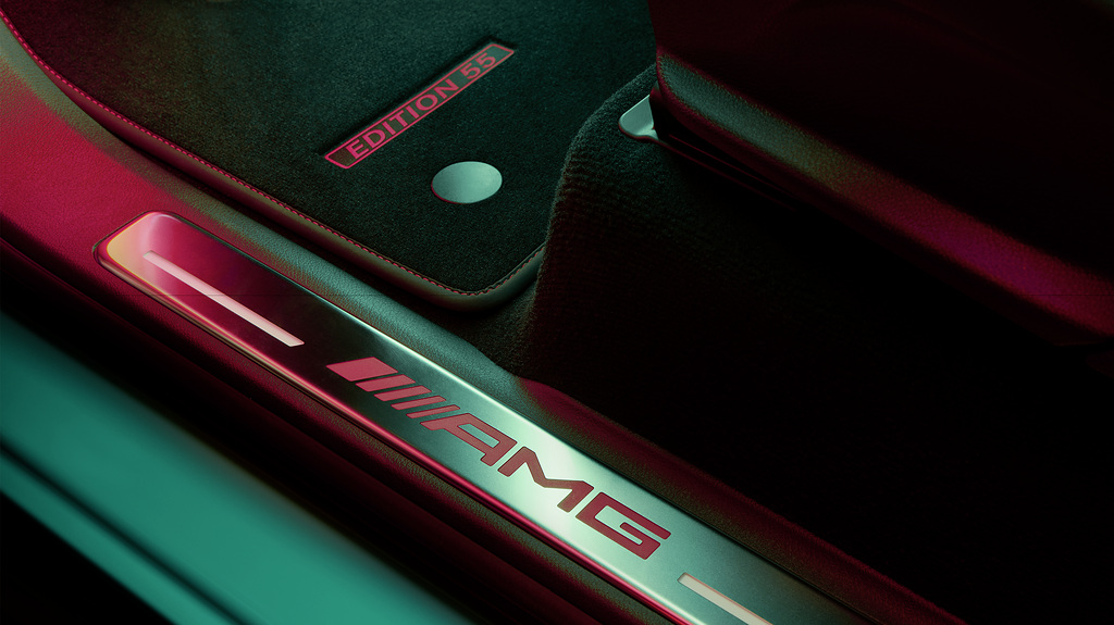 뿐만 아니라, 다이나미카 마이크로 파이버(DINAMICA microfiber) 소재 기반의 AMG 퍼포먼스 스티어링 휠에도 ‘AMG’와 ‘55’가 각인돼 한정판 모델의 특별함을 더했으며, 고급 벨루어 소재의 블랙 컬러 AMG 에디션 55 스페셜 플로어 매트는 레드 컬러의 스티칭 및 ‘에디션 55’ 레터링으로 장식돼 실내의 품격을 높였다.