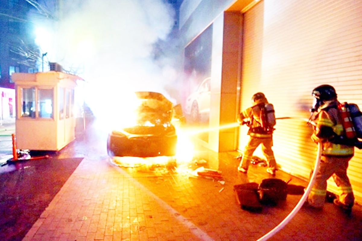 소방당국은 차주가 서비스센터에서 수리를 의뢰하고 차를 세워뒀는데, 얼마 지나지 않아 차량 안팎에서 물이 끓는 것 같은 소리가 들리더니 차량 아래에서 불꽃이 튀기 시작해 119에 신고했다고 밝혔다.