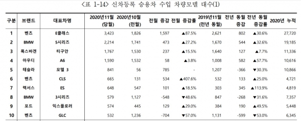 2일 자동차통계연구소 카이즈유 데이터에 따르면, 지난달 수입차 판매 TOP10에는 벤츠코리아가 E클래스를 비롯한 CLS, GLC등 3개 모델이 이름을 올렸다.