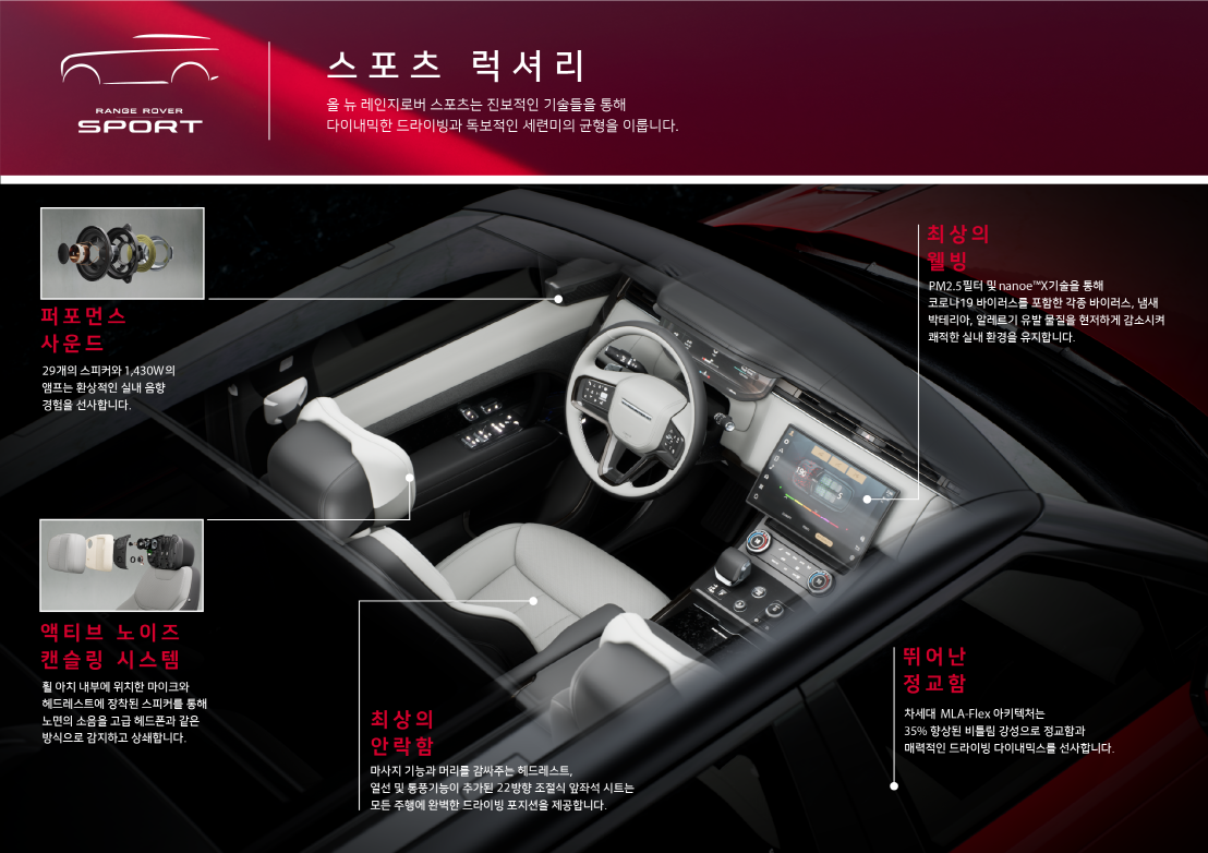 올 뉴 레인지로버 스포츠는 실내에 다양한 최첨단 기술을 도입해 탑승자 모두에게 높은 연결성, 웰빙 환경 등 차원 높은 스포츠 럭셔리 경험을 제공한다. PM2.5 필터 및 나노이(nanoeTM) X 기술을 탑재한 차세대 실내 공기 정화 프로(Cabin Air Purification Pro) 시스템은 코로나19 바이러스를 비롯한 각종 냄새, 박테리아, 알레르기 유발 물질을 감소시켜 쾌적한 실내 공기 질을 유지한다.