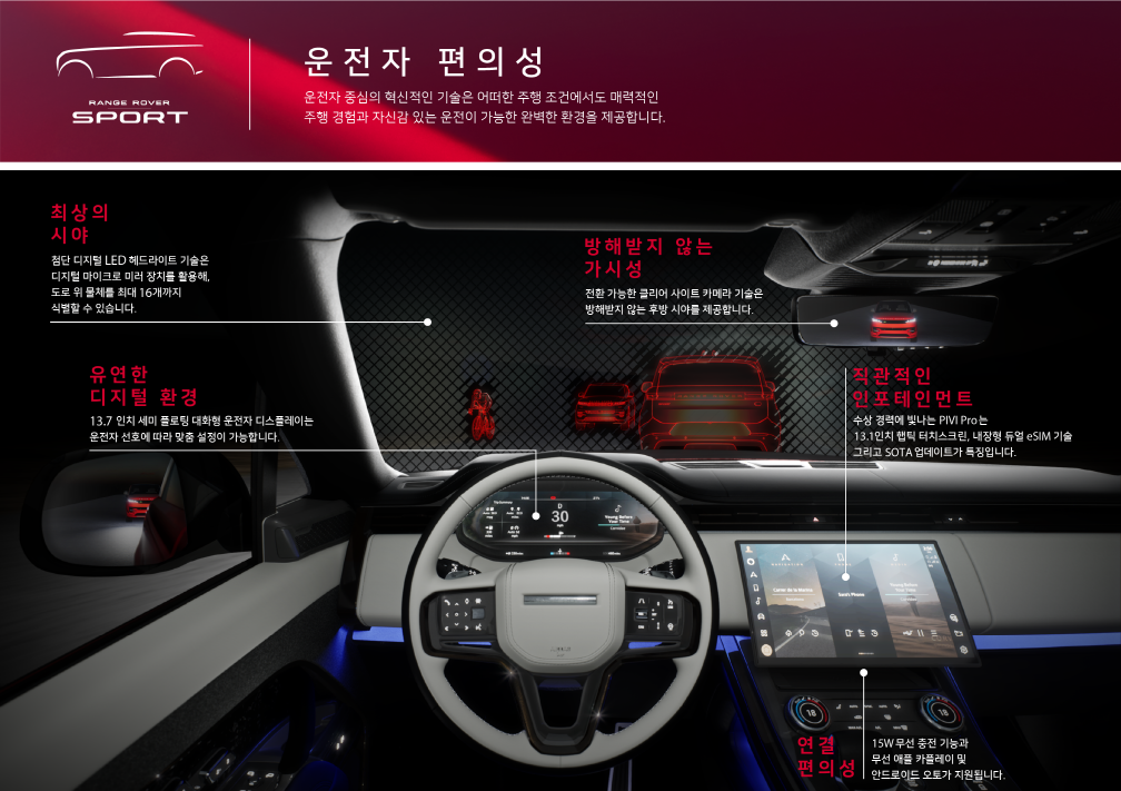 올 뉴 레인지로버 스포츠는 모델 최초로 피비 프로(PIVI Pro) 인포테인먼트 시스템을 탑재해 연결성을 강화했다. 단 두 번의 터치만으로 전체 기능의 90%를 사용할 수 있으며, 티맵 모빌리티의 T맵 내비게이션을 기본 내장해 국내 고객에게 높은 편의성을 제공한다.