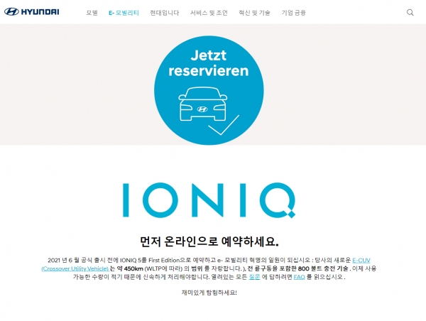 최근 현대차 오스트리아 법인이 개설한 아이오닉5 퍼스트에디션 사전계약 홈페이지에 따르면 현대차는 지난 18일부터 아이오닉5 퍼스트에디션 사전계약을 받고 있으며 이를 내년 1월 31일까지 진행한다. 계약금은 1천유로(135만원)이며 150대 한정 판매한다.
